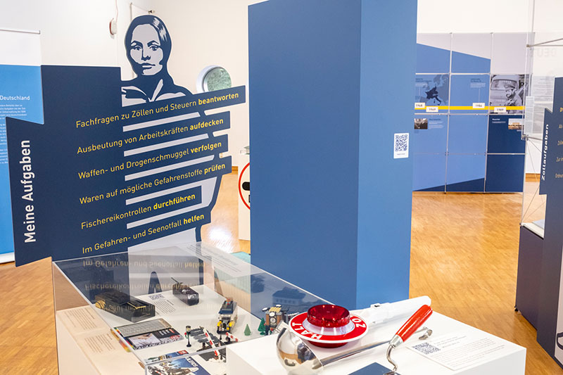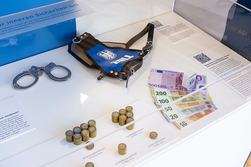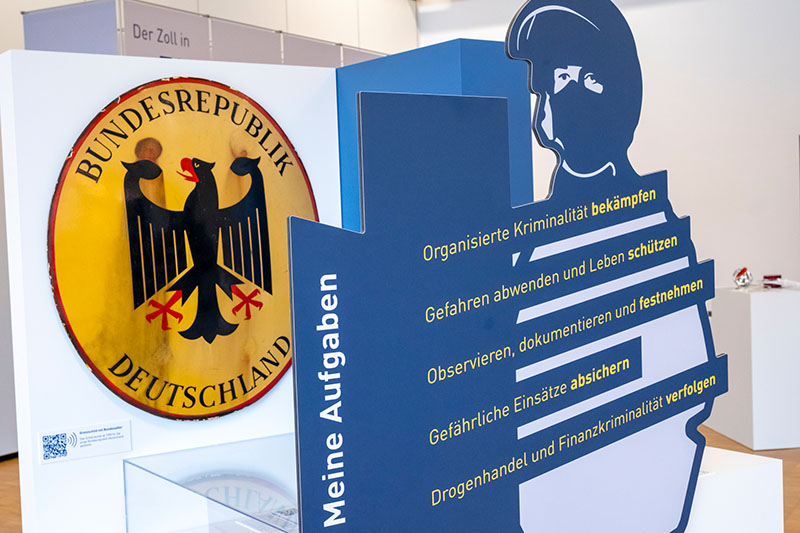 Neben historischen Einblicken und anschaulichen Exponaten erwartet die Besuchenden ein lebendiges und interaktives Ausstellungserlebnis, das den Wandel des Zolls bis in die Gegenwart hinein nachzeichnet. Die präsentierten Inhalte machen deutlich, wie sich das Aufgabenspektrum des Zolls stetig erweitert hat - von klassischen Aufgaben, wie der Erhebung von Zöllen und Verbrauchsteuern über die Grenzabfertigung und -überwachung bis hin zu den Herausforderungen der Gegenwart, wie der Bekämpfung von Schwarzarbeit, Geldwäsche, Produktpiraterie und neuer Formen organisierter Kriminalität. Mit einem Hinweis auf das Strukturprojekt "Zoll 2030" wird auch ein Blick in die Zukunft geworfen. Mit der Strategie "Zoll 2030" werden Aufgabengebiete in der Zollverwaltung gebündelt und die Organisation an der Spitze verschlankt. Zugleich werden die Zollbehörden vor Ort gestärkt und die Ermittlungs- und Vollzugseinheiten durch die Fusion der Hauptzollämter und Zollfahndungsämter noch schlagkräftiger gemacht. Der Zoll als Einnahmeverwaltung bleibt ein zentrales und konstantes Fundament: Der deutsche Zoll trägt seit jeher zur Finanzierung des öffentlichen Haushalts in Deutschland und Europas bei.